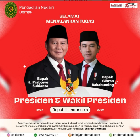 Keluarga Besar Pengadilan Negeri Demak mengucapkan Selamat Bertugas kepada Presiden Prabowo Subianto dan Wakil Presiden Gibran Rakabuming periode 2024 - 2029 Konten : berita kegiatan Telah dibaca : 22 Kali Keluarga Besar Pengadilan Negeri Demak mengucapkan Selamat Bertugas kepada Presiden Prabowo Subianto dan Wakil Presiden Gibran Rakabuming periode 2024 - 2029 « kembali
