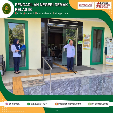 Apel Pagi Konten : berita kegiatan Telah dibaca : 25 Kali Demak - 21 Oktober 2024 Telah dilaksanakan Apel Pagi Pada Pengadilan Negeri Demak yang dipimpin oleh Panitera PN Demak, Bapak Ismail, S.H.,M.H. dan diikuti oleh Ketua, Wakil Ketua, Hakim, Panitera, ASN dan PPNPN Pengadilan Negeri Demak. « kembali