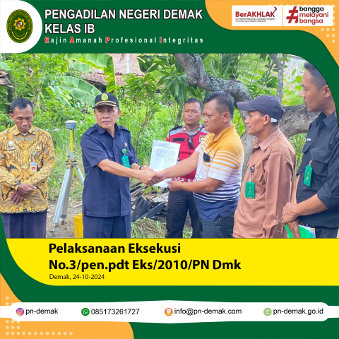 Pada hari Kamis tanggal 24 Oktober 2024 telah dilaksanakan eksekusi perkara Nomor 3/Pdt.Eks/2024/PN Dmk Jo Nomor 771/PK/Pdt/2011 Jo Nomor 6/Pdt.G/2000 perkara antara Hj. Rakini binti H. Abdul Fatah, dkk terhadap H. Abdul Nasroh alias H. Dul Nasroh bin H. Abdul Fatah dan Muslimin bin Tamri, dkk dibantu oleh petugas dari Polres Demak sejumlah 57 (lima puluh tujuh) orang, dari Polsek Mranggen sebanyak 15 (lima belas) orang , BPN Demak sebanyak 5 (lima) orang dan dari Desa Batursari 4 (empat) orang.