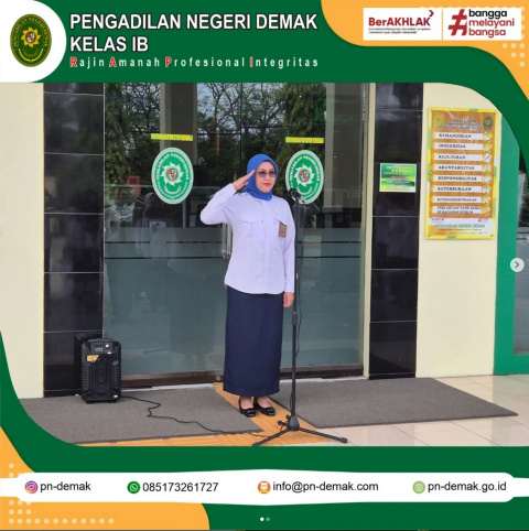 Telah dilaksanakan Apel Pagi Pada Pengadilan Negeri Demak yang dipimpin oleh Wakil Ketua PN Demak, Ibu Niken Rochayati, S.H.,M.H. dan diikuti oleh Ketua, Hakim, Panitera, Sekretaris, Cakim, ASN dan PPNPN Pengadilan Negeri Demak.