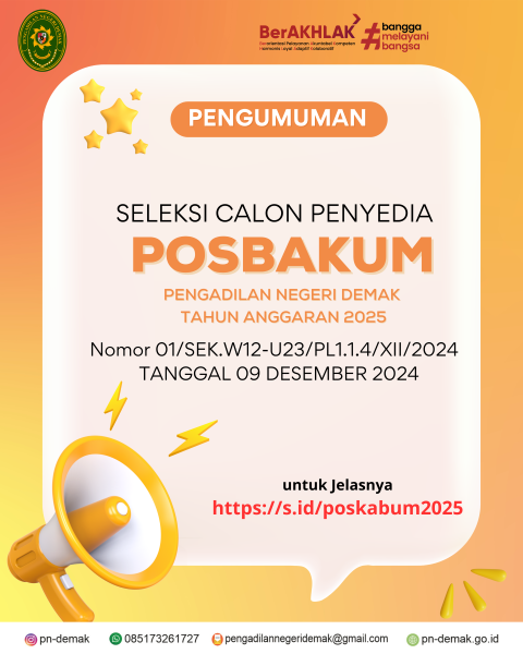 SELEKSI LEMBAGA PEMBERI LAYANAN POS BANTUAN HUKUM TAHUN ANGGARAN 2025 PENGADILAN NEGERI DEMAK KELAS IB. Konten : berita kegiatan Telah dibaca : 115 Kali PENGUMUMAN! ???????????? SELEKSI LEMBAGA PEMBERI LAYANAN POS BANTUAN HUKUM TAHUN ANGGARAN 2025 PENGADILAN NEGERI DEMAK KELAS IB. untuk jelasnya silahkan kunjungi posbakum2025 « kembali
