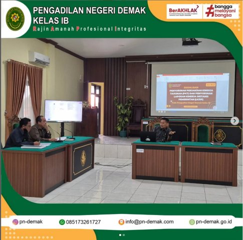 Sosialisasi Penyusunan Perjanjian Kinerja Tahunan (PKT) dan Penyusunan laporan Kinerja Instansi Pemerintah (LKJiP) Konten : berita kegiatan Telah dibaca : 27 Kali Demak - 24 Desember 2024 Pengadilan Negeri Demak mengadakan Sosialisasi Penyusunan Perjanjian Kinerja Tahunan (PKT) dan Penyusunan laporan Kinerja Instansi Pemerintah (LKJiP) pada Pengadilan Negeri Demak. « kembali