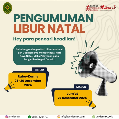 Sehubungan dengan perayaan Hari Natal, dengan ini disampaikan bahwa kegiatan operasional pada Pengadilan Negeri Demak akan LIBUR pada: