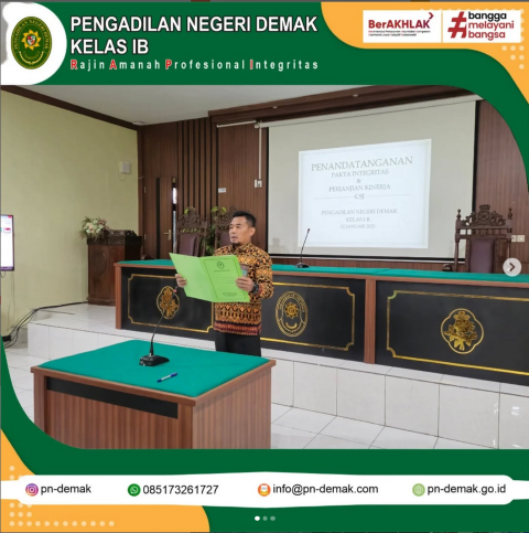 Ketua PN Demak, Bapak Muhamad Fauzan Haryadi, S.H.,M.H. memimpin Penandatanganan Pakta Integritas dan Perjanjian Kinerja tahun 2025 yang dilaksanakan di Aula Pengadilan Negeri Demak.