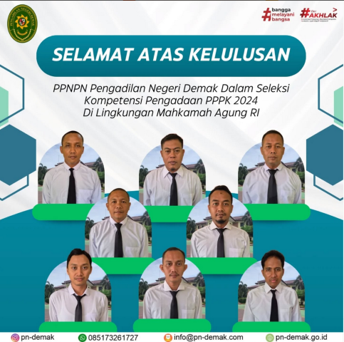 Segenap Pimpinan dan Keluarga Besar Pengadilan Negeri Demak Mengucapkan Selamat dan Sukses Kepada Seluruh PPNPN Pengadilan Negeri Demak atas Kelulusannya Dalam Seleksi Kompetensi Pengadaan PPPK Pada Mahkamah Agung RI Tahun 2024.