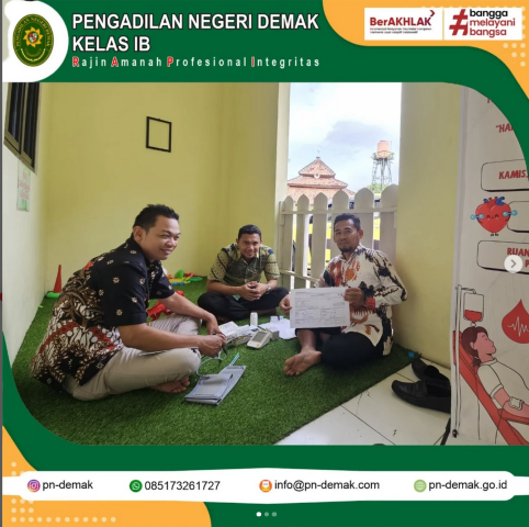 Pengadilan Negeri Demak bekerja sama dengan PMI Kab. Demak melaksanakan Kegiatan Donor Darah yang di ikuti seluruh keluarga Besar Pengadilan Negeri Demak