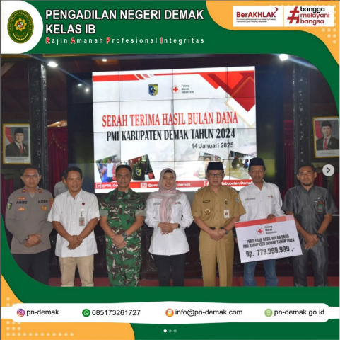 Serah Terima Hasil Bulan Dana PMI Kabupaten Demak Konten : berita kegiatan Telah dibaca : 37 Kali Demak - 14 Januari 2025 Ketua PN Demak, Bapak Muhamad Fauzan Haryadi, S.H.,M.H. menghadiri Undangan Serah Terima Hasil Bulan Dana PMI Kabupaten Demak yang diselenggarakan di Pendopo Kabupaten Demak. « kembali