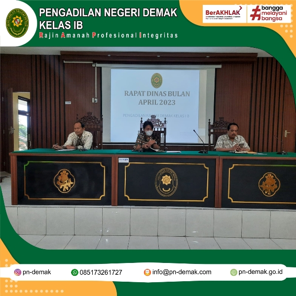 Bertempat dilantai 2 Pengadilan Negeri Demak, dilaksanakan rapat bulanan, Pembinaan oleh Wakil Ketua Pengadilan Negeri Demak. Ibu Lusi Emmi Kusumawati. S.H,. M.H. Rapat diikuti para Hakim, Sekretaris, Sekretaris, Pejabat Struktural, Pejabat Fungsional , Staf dan PPNPN Pengadilan Negeri Demak.