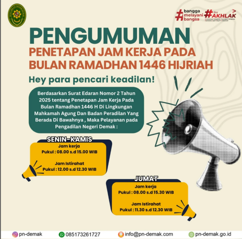Berdasarkan Surat Edaran Nomor 2 Tahun 2025 tentang Penetapan Jam Kerja Pada Bulan Ramadhan 1446 H Di Lingkungan Mahkamah Agung Dan Badan Peradilan Yang Berada Di Bawahnya, Maka Pelayanan pada Pengadilan Negeri Demak: