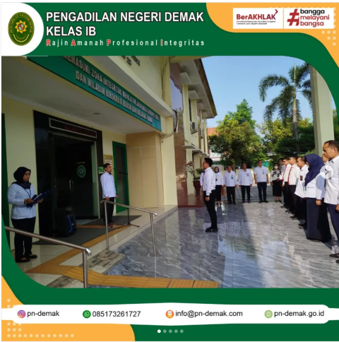 Telah dilaksanakan Apel Pagi Pada Pengadilan Negeri Demak yang dipimpin oleh Ketua PN Demak, Bapak Muhamad Fauzan Haryadi, S.H.,M.H. dan diikuti oleh Wakil Ketua, Hakim, Panitera, Sekretaris, Cakim, ASN dan PPNPN Pengadilan Negeri Demak.