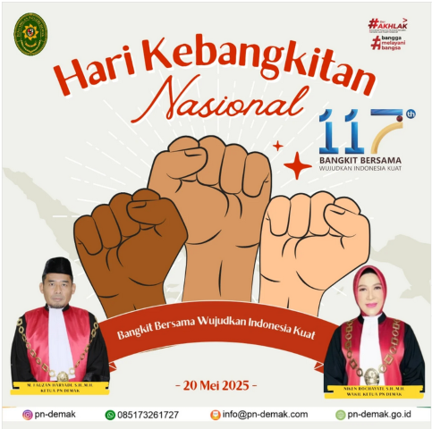 Pengadilan Negeri Demak mengucapkan Selamat Memperingati Hari Kebangkitan Nasional ke-117. Konten : berita kegiatan Telah dibaca : 24 Kali Demak - 20 Mei 2025 Pengadilan Negeri Demak mengucapkan Selamat Memperingati Hari Kebangkitan Nasional ke-117. "Bangkit Bersama Wujudkan Indonesia Kuat" « kembali