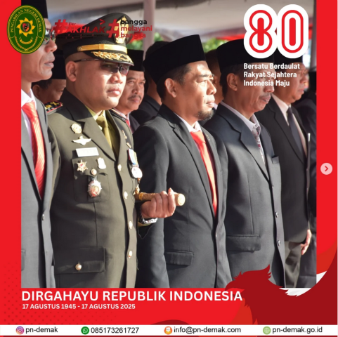 Ketua Pengadilan Negeri Demak, Bp. Muhamad Fauzan Haryadi, S.H., M.H. menghadiri Upacara Bendera Peringatan Detik-Detik Proklamasi Kemerdekaan Republik Indonesia ke-80 "Bersatu Berdaulat Rakyat Sejahtera Indonesia Maju" tingkat Kabupaten Demak. Acara tersebut dilaksanakan di Alun-alun Demak.