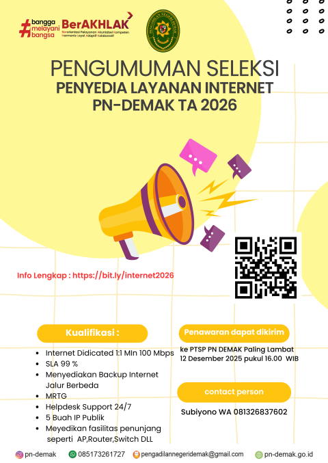 Pengadilan Negeri Demak membuka kesempatan bagi para penyedia jasa internet untuk mengikuti proses seleksi Tahun Anggaran 2026.