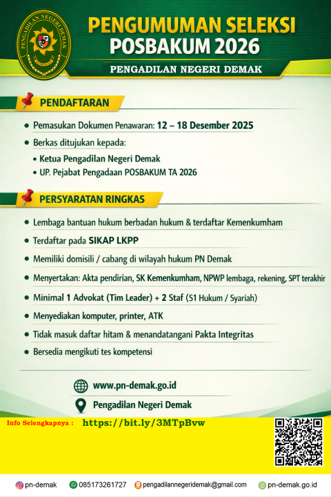 Pengumuman Pengadaan Jasa Pos Bantuan Hukum (POSBAKUM) Tahun Anggaran 2026 Konten : berita kegiatan Telah dibaca : 57 Kali PENDAFTARAN Calon Penyedia Jasa Pos Bantuan Hukum (POSBAKUM) Tahun Anggaran 2026 dengan ketentuan sebagai berikut : Pengumuman « kembali