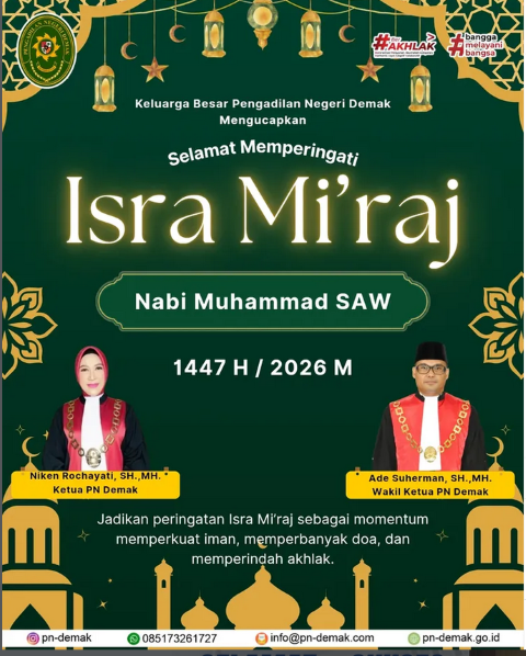 Selamat Memperingati Isro Miroj, Nabi Muhammad SAW 1447H/ 2026M Konten : berita kegiatan Telah dibaca : 2 Kali Demak - 16 Januari 2026 Keluarga Besar Pengadilan Negeri Demak mengucapkan Selamat Memperingati Isro Miroj, Nabi Muhammad SAW 1447H/ 2026M "Jadikan peringatan Isra Miraj sebagai momentum memperkuat iman, memperbanyak doa, dan memperindah akhlak" « kembali