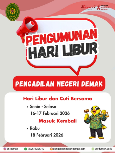 Pelayanan Pengadilan Negeri Demak libur pada : 16-17 Februari 2026 Konten : berita kegiatan Telah dibaca : 7 Kali Hai sobat peradilan..!! Sehubungan adanya hari libur tahun baru imlek dan cuti bersama, Pelayanan Pengadilan Negeri Demak libur pada : 16-17 Februari 2026 Pelayanan akan dibuka kembali pada : 18 Februari 2026 « kembali