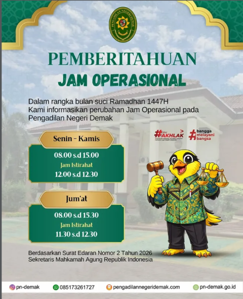 Kami informasikan perubahan Jam Operasional pada Pengadilan Negeri Demak