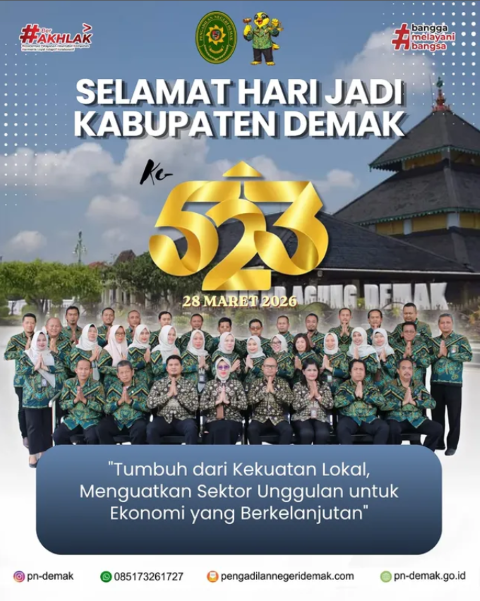 Selamat Hari Jadi Kabupaten Demak ke - 523 Konten : berita kegiatan Telah dibaca : 1 Kali Demak - 28 Maret 2026 Keluarga Besar Pengadilan Negeri Demak mengucapkan Selamat Hari Jadi Kabupaten Demak ke - 523 28 Maret 2026 "Tumbuh dari Kekuatan Lokal, Menguatkan Sektor Unggulan untuk Ekonomi yang Berkelanjutan" « kembali