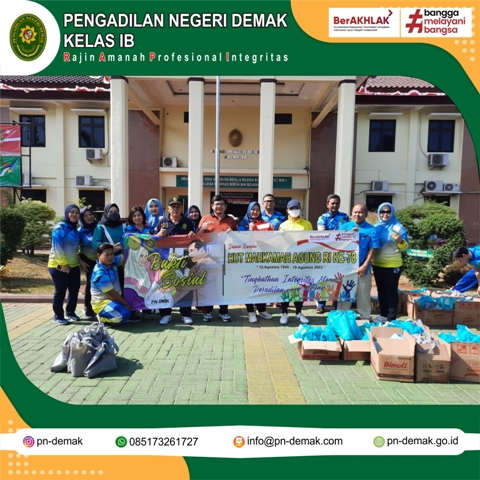 BAKTI SOSIAL DALAM RANGKA MEMPERINGATI HUT MARI KE-78 Konten : berita kegiatan Telah dibaca : 26 Kali Demak, 18 Agustus 2023, dengan memperingati HUT MARI ke-78 dipimpin oleh Ketua Pengadilan Negeri Demak Bapak Muhammad Eri Justiansyah, S.H. mengadakan Bakti Sosial di Halaman Depan Pengadilan Negeri Demak. « kembali