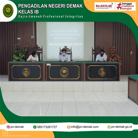 Demak – Senin, 30 Oktober 2023. Pengadilan Negeri Demak melaksanakan Rapat Bulanan Rutin Bulan Oktober Tahun 2023 di Ruang Aula lantai 2 Pengadilan Negeri Demak Kelas IB. Rapat bulanan tersebut dimulai pada pukul 10.00 WIB.