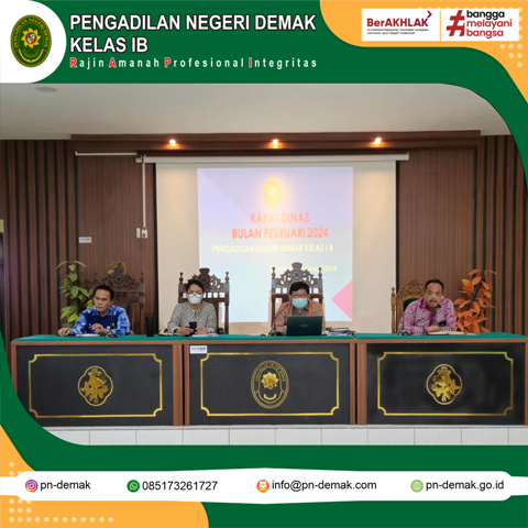 Demak, 29 Februari 2024 telah diadakan Rapat Dinas Bulan Februari 2024 pada Pengadilan Negeri Demak Kelas IB yang dipimpin oleh Ketua Pengadilan Negeri Demak.diawali dengan menyanyikan lagu Indonesia Raya dan Hymne Mahkamah Agung dan pemutaran core film core value asn berakhlak. Rapat tersebut diikuti oleh seluruh Hakim, Calon Hakim, Pejabat Struktural, Fungsional, Karyawan, Karyawati dan PPNPN di lingkungan Pengadilan Negeri Demak.