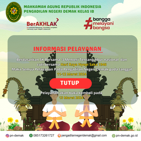 informasi cuti bersama hari raya nyepi Konten : berita kegiatan Telah dibaca : 73 Kali Berdasarkan SK Bersama 3 Menteri Tentang libur nasional dan cuti bersama Hari Raya Nyepi Saka 1946 Maka Semua Pelayanan Pada Pengadilan Negeri Demak pada tanggal 11-12 Maret 2024 Tutup dan akan dibuka Kembali pada 13 Maret 2024 « kembali