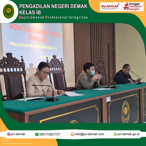 Pada hari Rabu, 15 Mei 2024, telah dilaksanakan rapat monitoring dan evaluasi ( MONEV ) Penyerapan realisasi anggaran belanja Dipa 01 dan Dipa 03 triwulan I tahun anggaran 2024 yang bertempat di ruang Aula Pengadilan Negeri Demak.