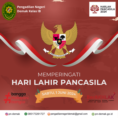 Selamat Hari Lahir Pancasila 2024 Konten : berita kegiatan Telah dibaca : 93 Kali Keluarga Besar Pengadilan Negeri Demak Kelas IB mengucapkan Selamat Hari Lahir Pancasila 2024 “Pancasila Jiwa Pemersatu Bangsa Menuju Indonesia Emas” « kembali