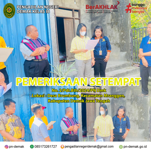 Majelis Hakim Pengadilan Negeri Demak, yang dipimpin oleh Wakil Ketua,Pengadilan Negeri Demak Ibu Lusi Emmi Kusumawati,S.H.,M.H. sebagai Ketua Majelis dalam perkara Gugatan Bantahan dengan Register Nomor Perkara: 2/Pdt.Bth/2024 PN Demak telah melaksanakan sidang Pemeriksaan Setempat dengan objek sebuah rumah yang berlokasi di Desa Brumbung, Kecamatan Mranggen, Kabupaten Demak. Pada hari Jumat tanggal 21 Juni 2024.