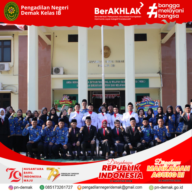 Sabtu,17 Agustus 2024. Pengadilan Negeri Demak melaksanakan Upacara Bendera Peringatan Hari Ulang Tahun Republik Indonesia ke-79. Wakil Ketua Pengadilan Negeri Demak bertindak sebagai Pembina Upacara dan diikuti seluruh Keluarga Besar Pengadilan Negeri Demak. Upacara dilaksanakan bertempat di halaman depan Kantor Pengadilan Negeri Demak
