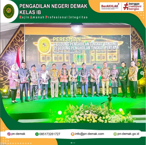 Wakil Ketua Pengadilan Negeri Demak, Ibu Niken Rochayati, S.H., M.H. menghadiri Peresmian 4 Gedung Pengadilan Tingkat Banding dan 21 Gedung Pengadilan Tingkat Pertama oleh Yang Mulia Ketua Mahkamah Agung Republik Indonesia, Prof. Muhammad Syarifudin S.H. M.H. yang diselenggarakan di Pengadilan Agama Slawi, Kabupaten Tegal.