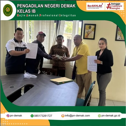 Kamis, 12 September 2024 bertempat di Ruang Mediasi Pengadilan Negeri Demak, mediasi berhasil dipandu oleh Ketua Pengadilan Negeri Demak, bapak Muhamad Fauzan Haryadi, S.H.,M.H yang ditunjuk sebagai Mediator oleh Majelis Hakim dalam perkara gugatan Wanprestasi dengan nomor register: 43/Pdt.G/2024/PNDmk.