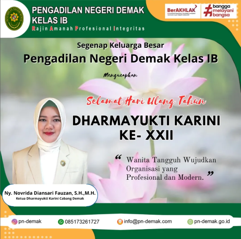 Selamat Hari Ulang Tahun Dharmayukti Karini ke XXII. Konten : berita kegiatan Telah dibaca : 43 Kali Keluarga Besar Pengadilan Negeri Demak Mengucapkan: Selamat Hari Ulang Tahun Dharmayukti Karini ke XXII. "Wanita Tangguh Wujudkan Organisasi yang Profesional dan Modern." « kembali